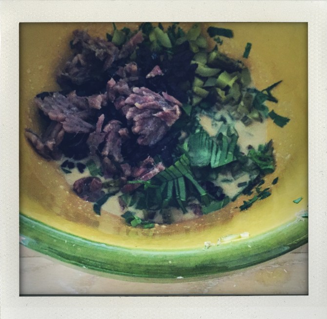 Y ajouter les herbes fraîches ciselées et les ingrédients du moment, de la réserve, du placard, hachés en gros. Il faut des morceaux, c’est important les morceaux. Faire de même avec l’oeuf dur.