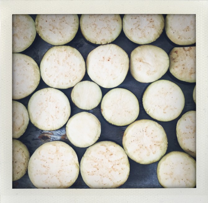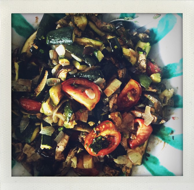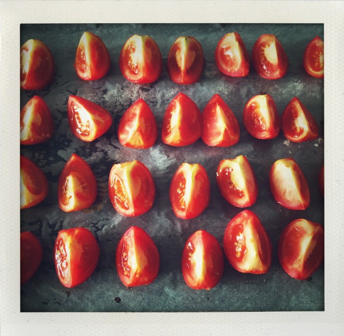 Elle fait de même avec les aubergines, coupée en tranches, puis les courgettes coupées elles dans la longueur (en quart si elles sont petites), et avec les tomates cerises coupées en deux. Je vois bien que c’est à l’œil qu’elle décide que le temps passé au four est suffisant. Pour les tomates, c’est décisif, elles ne doivent pas être au delà de très légèrement déshydratées. À peine affaissées, encore juteuses, sans se déliter, ni même confire.