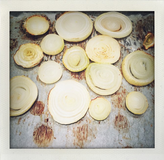 Elle coupe des oignons rouges en tranches épaisses, environ 1 cm. Les met au four chaud mais pas trop (160 maxi…), à plat sur une plaque, pour que les oignons cuisent sans colorer ni sécher.